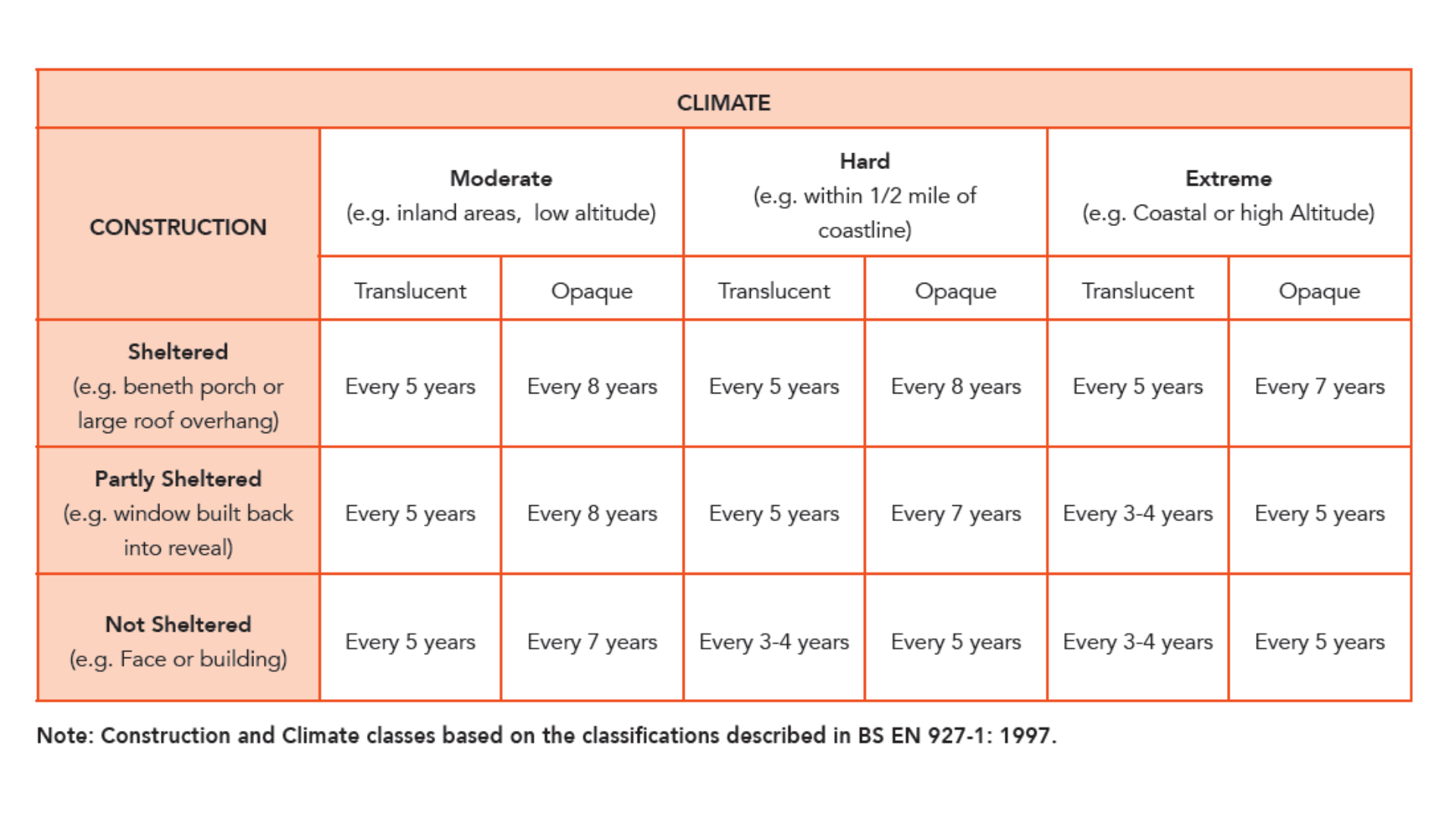 A suggested recoat/maintenance coating table is shown in Table 1, however, in practice, carrying out the first redecoration approximately one year before the recommended time will significantly improve the longevity of the coating system. By using this table, the redecoration period for each face can therefore be evaluated.